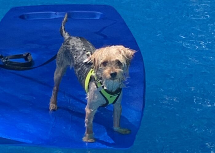 Swimming to his float everyday. Eating very well. He has lots of friends. His allergies are under control. Alfie is living his best life!!! ~Dale T.