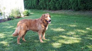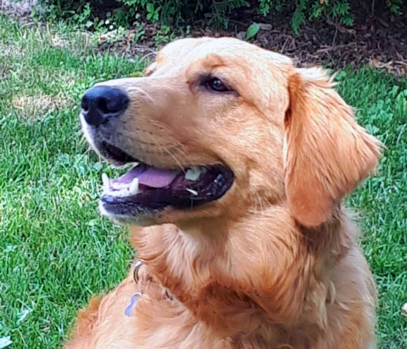 Blake, a 10-month golden retriever, is a lovely boy. Blake entertains himself rolling in the grass, finding sticks, spending hours chomping on his chew toys or carrying a random sock in his mouth. He is a fun dog to have around, is quite smart and highly treat motivated, so learning new commands comes easily. He is learning to exchange objects that he acquires for a treat. He has learned the word bedtime and willingly takes himself to his doggy bed.