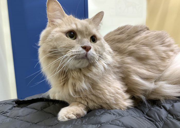 Caramel is a beautiful five year old medium haired boy. Caramel can be shy and nervous at first, but loves nothing more than to cuddle up with you. He is a gentle sweet boy who will spend as much time as you like snuggled up beside you. He really enjoys being petted and brushed. Caramel would do best in a quiet home.