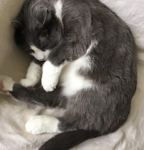 Tough day for Freddy…. Thank you again, Gerdy, for bringing us Freddy! It’s been ten years and we (and Tibbit) love every moment of him! xoxoxo Muffy and Zoe