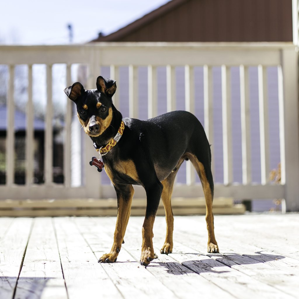 True to his breed, Min Pins are known to be climbers, diggers and nimble escape artists. Hamlet must be kept on a leash or in a securely fenced area at all times, like his Min Pin relatives, he is sharp-eyed, curious, and quick to react.