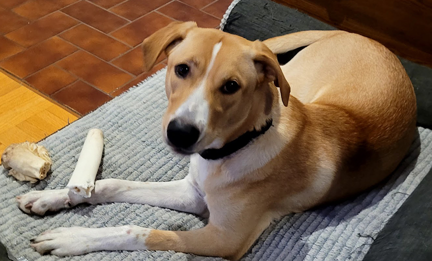 Jack is quiet, independent, loves to chew on toys. He is vocal when he plays but otherwise not a barker. He is scared of cats but curious of squirrels and chases leaves in the wind. He has Daisy to play with and enjoys playing with other dogs. Jack is very good around people but has not met any young children yet. Surprisingly for a lab mix, Jack does not like water.Jack weighs approx. 75-80lbs. is housetrained, sterilized and vaccinated. He takes supplements for his hips.