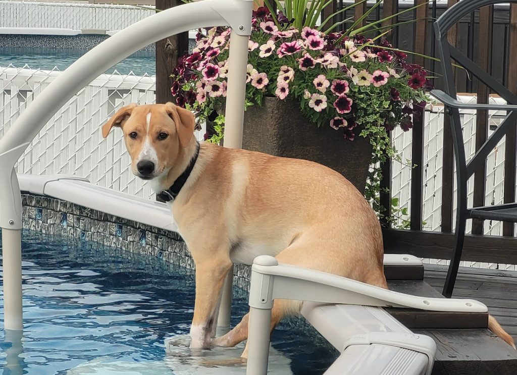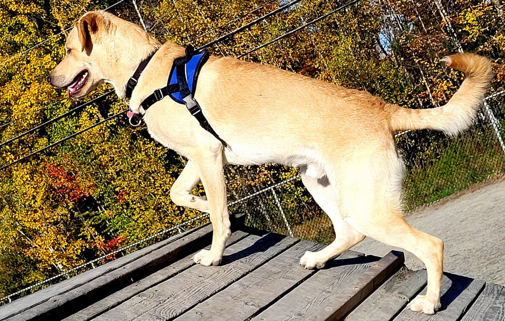 Daisy is very affectionate once she knows and trusts you, she will follow you everywhere but takes a bit of time to warm up. She walks very well on leash but does not love her harness. Daisy loves the water and has already been swimming a few times and is always game for a few rounds of fetch. She is protective of Jack and the house and barks at the window or the doorbell and will jump on visitors when arriving. She has shown some anxiety when left alone in the house but has successfully stayed out of her cage for up to 4 hours. She guards her toys and “stuff” but an adult can remove anything from her. She is selective with the dogs she plays with and would need supervised introductions. Her issue seems to be that her focus is to protect Jack and be his one and only.Daisy weighs 70-75lbs is housetrained, vaccinated and sterilized. She takes supplements for her hips.