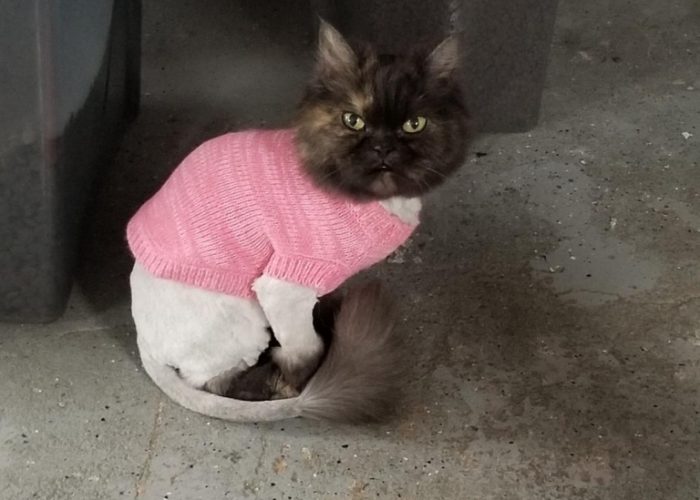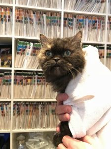 10-year old Maisie was rescued from a sparse basement apartment when her previous guardian was placed in a palliative care. This exquisite and unusual tortoiseshell Persian has regained her appetite and is playing with toys which she probably never had before.