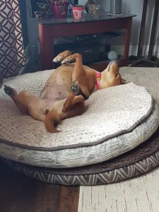 Pepper (was Mia), survived death when found running on Autoroute 40 and a kind soul stopped rush hour traffic and hauled her into her car to bring her to safety. Then a routine vet check showed a mass and on investigation it was deemed malignant. The mass was removed with wide safe margins and 8 months later Pepper, the survivor, is in fine form and “healthy as a horse”! She is 6 years young and full of energy.