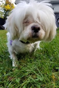 She is approximately 7-8 years old, bichon x. She is a real sweetheart, super friendly and quickly learning how to survive sightless.