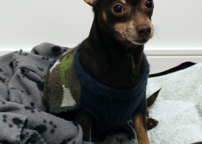 This 6 ½ year old girl is pretty perfect in every way. She is a survivor from a small puppy mill seizure and has adapted to her new life and freedom very well with the help of her wonderful foster moms. She is calm, easy to have around and a real snuggler. She likes her leash walks, less in the cold weather, and has learned to use pee pads when the temperature is too cold.