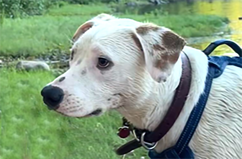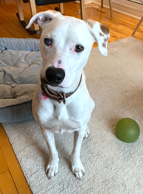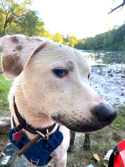 He is a young 1 ½ year old mix of many things (Lab, Dalmatian-your guess). This white knight will make a great companion for an adult family living in the burbs or in a rural area. He needs work on curbing his “jumping for joy” when he meets new humans.Théo is neutered, vaccinated, microchipped. He weighs 25 kg. (55 lbs.). He is blind from birth, in one eye.